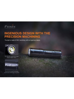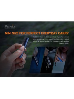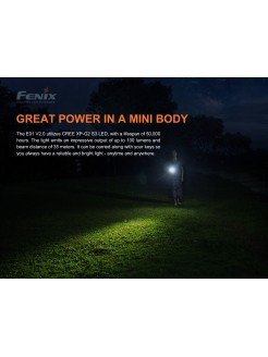 La Fenix E01 V2.0 es una linterna mini llavero con un tamaño y peso insignificantes. De la única batería AAA incluida, emite una impresionante salida de hasta 100 lúmenes. La luz es bastante duradera con un cuerpo de luz de mecanizado CNC totalmente metálico, acabado anti-abrasivo anodizado duro tipo premium HAIII y excelente capacidad impermeable. Tamaño extremadamente pequeño, interruptor giratorio conveniente y flexible 3 niveles de salida hacen el? E01?la respuesta al acarreo diario. La linterna ultracompacta Fenix E01 V2.0 se puede llevar junto con sus llaves para que siempre tenga una luz confiable y brillante en cualquier momento y en cualquier lugar.