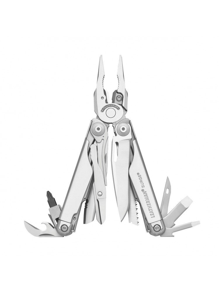 La Leatherman Surge es una de nuestras dos multiherramientas más grandes; Una verdadera potencia, construida con nuestros alicates más grandes, cuchillas multiherramienta más largas y cerraduras fáciles de usar. Un intercambiador de cuchillas único, cortadores de alambre premium reemplazables y cuatro cuchillas de apertura exterior le brindan acceso rápido a las herramientas que más usa. El Surge fue construido para trabajos duros y las manos que los hacen. El clip de bolsillo compatible se vende por separado.